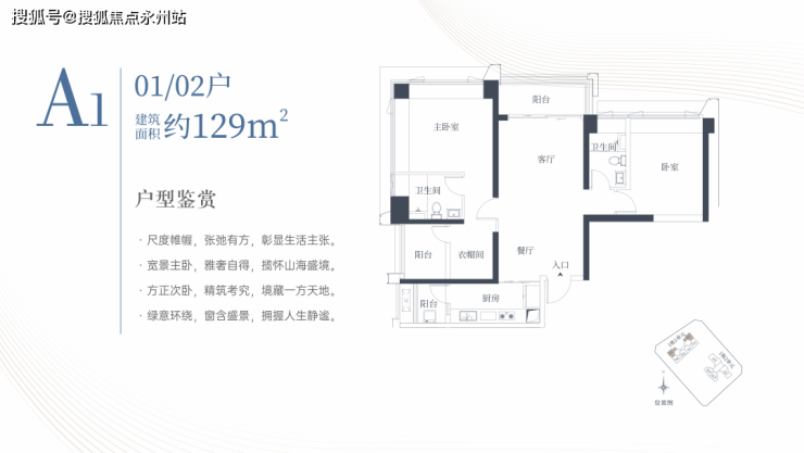 129㎡3房2卫A1户型,竖厅双龙抱珠格局,西北朝向,得房率在77%左右。
