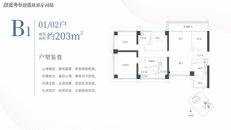 203㎡四房两卫,竖厅设计,南北通透,得房率72%左右,东北朝向。