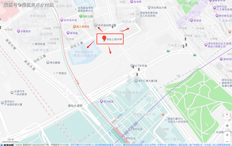 深业上城学府位于龙华区民塘路和白松西路交汇处,临近深圳北站。项目的北面,为华侨城北站壹号写字楼及公寓;