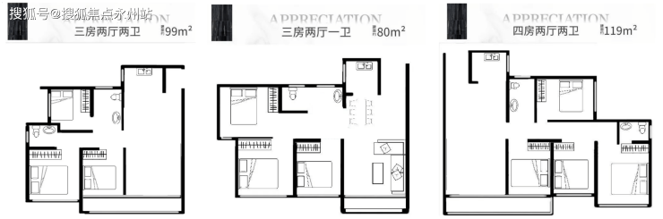 80㎡的3房2厅1卫户型;约三种99㎡的3房2厅2卫户型;
