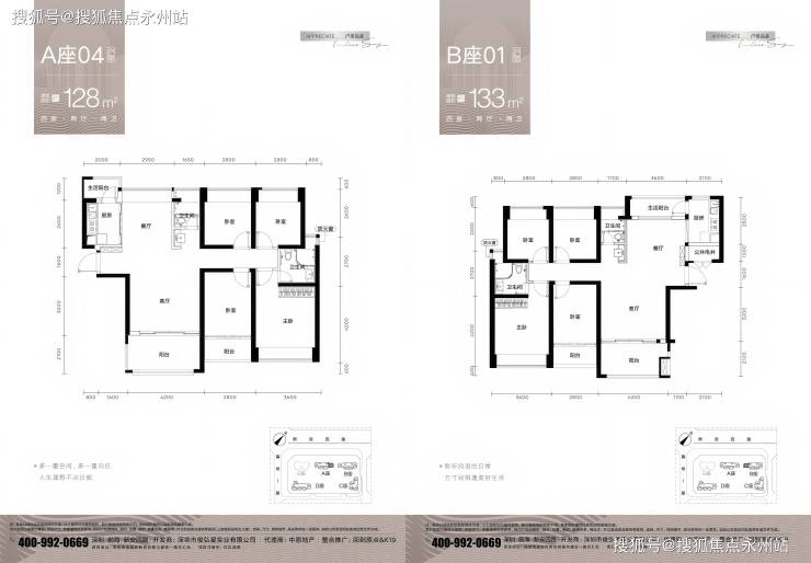 A/B 座:128-133㎡四房两厅两卫,东南朝向,2 梯 4 户,适合改善型家庭。