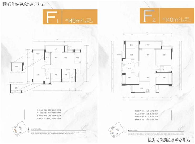 140㎡三房两厅三卫F1:户型东北朝向,横厅设计。几乎全飘窗+大双阳台设计,赠送拉满。但是说实话,140平只做到三房,空间使用效率不高,这种产品在深圳怕是没啥竞争力了。