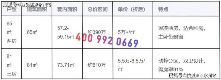 户型面积:主力为65㎡两房(得房率88-91%)和81㎡三房(得房率91%),均为新规设计,实际使用面积接近传统70-85㎡户型。