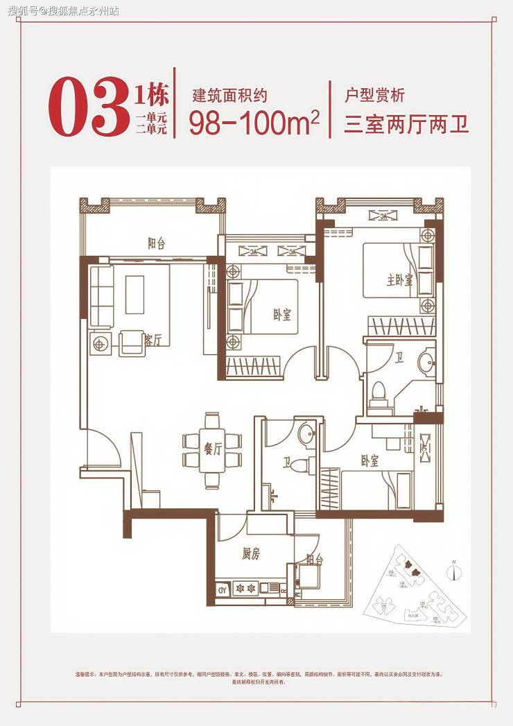约95-97㎡三房两厅两卫:南向端头位,三面采光,可瞰花园景观,主卧带独立卫生间,总价416-494万。