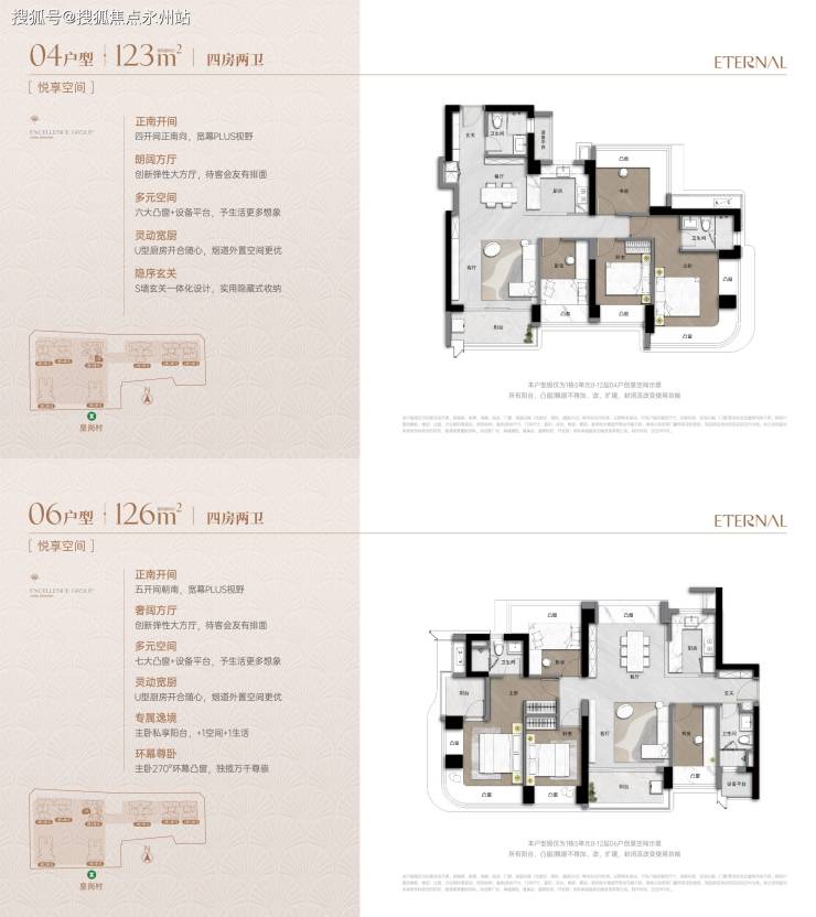 空间尺度:123㎡户型客厅开间4.2米,126㎡户型实现南北通透,主卧均采用270°弧形飘窗,搭配独立卫浴与衣帽间,营造酒店式居住体验。