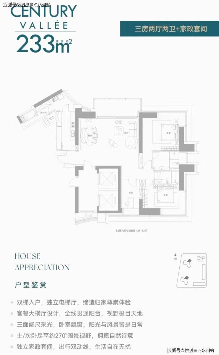 233㎡的3房2厅2卫+家政套间,仅3栋A/B座A户型,双梯入户,设计的是横厅格局,客餐厅7.9米开间,动静分区,主卧大套间约24㎡,大次卧约19㎡,小次卧约14.82㎡,另外还有独立保姆套房,一字型厨房,得房率约66.03%(不含赠送),约11.4㎡观景大阳台,西北朝向,看高尔夫景观。