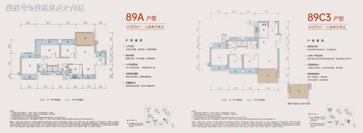 建面约89㎡三房两厅两卫(竖厅/横厅可选)
