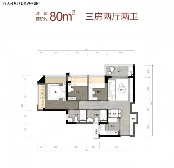 亮点:在有限面积内实现双卫配置,S型冰箱位优化厨房空间,全屋中央空调为标配。