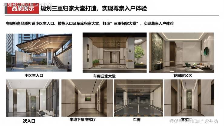 高规格高品质打造小区主入口、楼栋入口及车库归家大堂,打造”三重归家大堂”,实现尊崇入户体验。