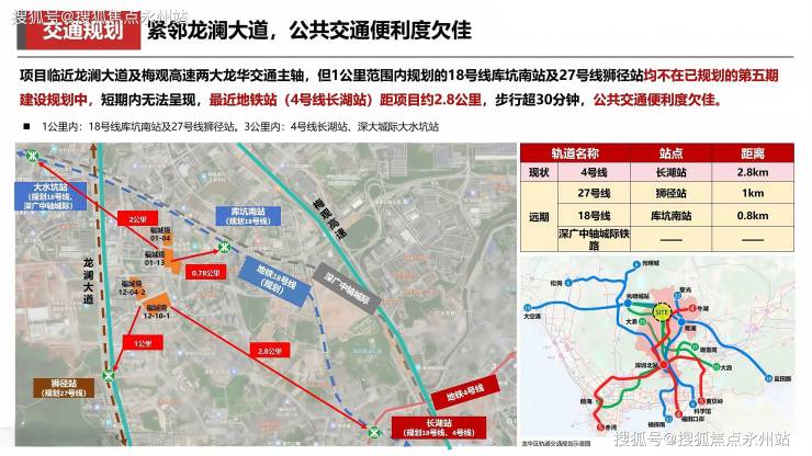 项目区域内主次干路体系完善,交通便捷。片区交通规划优异,规划打造“4线2路”的交通体系,1公里范围内拥享18号线库坑南站及27号线狮径站,临近梅观高速及龙澜大道两大龙华交通主轴,30分钟可达深圳北站及福田CBD核心区,不过当前最近的4号线“长湖站”距离约2.8公里,步行超30分钟以上。