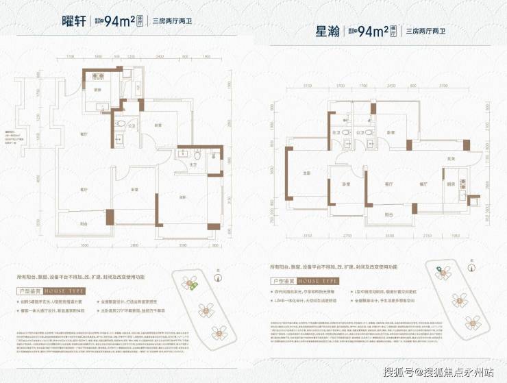 94㎡户型有竖厅和横厅两种选择,其中横厅户型采用南北通透格局,全屋飘窗环绕,多达10面飘窗,得房率约93.73%。