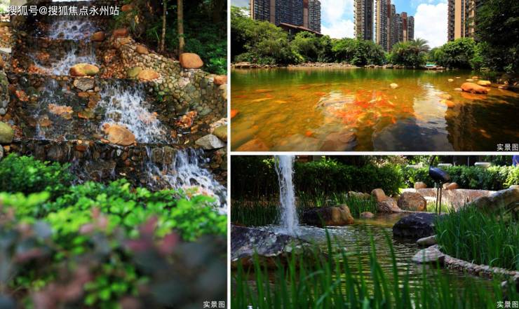 项目内部打造了一条沿着台地蜿蜒的溪流,该水系为市面罕见的活水溪流,贯穿整个社区园林,依据溪岸的曲直不同和地形变化,打造叠水、溪流、瀑布、水潭等多样特色水景,溪岸植物种类繁多,与水流互为风景,沿岸专门设置不同的亲水平台,营造自然灵动的栖心之境。