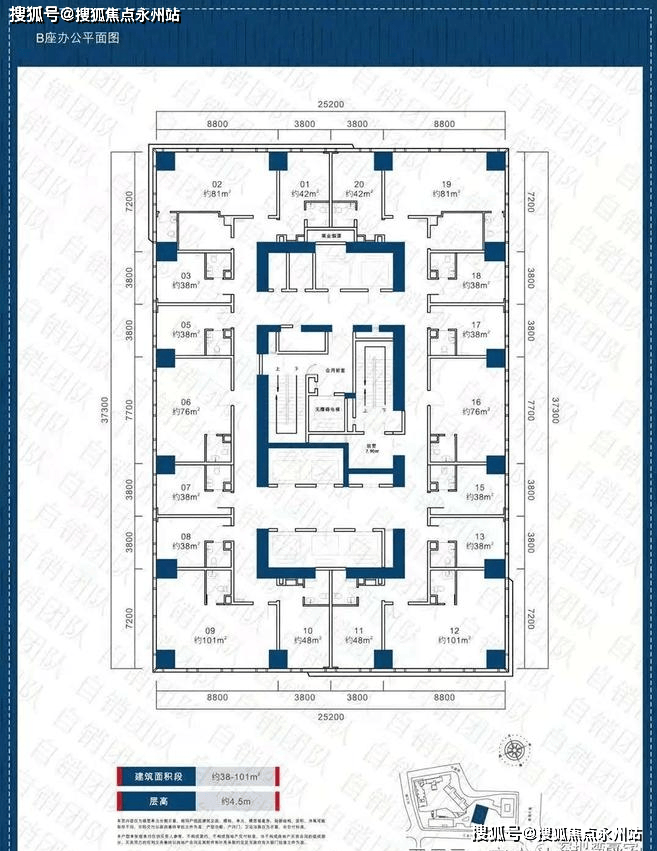 【B座】办公楼及公寓。高度188.2米,43层,办公建面23328㎡+商务公寓建面13839㎡。