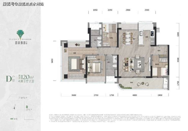 120㎡的4房2厅2卫,D户型,设计的是竖厅南北通透格局,进门入户玄关,客厅4.8米开间,LDKB一体化设计,五开间朝南,4个卧室分别做到了主卧18.9㎡/次卧10.2㎡/次卧6.77㎡/次卧6.4㎡(实测面积),客厅连接次卧出7.25米长的巨幕大阳台,U型厨房,卫生间干湿分离,得房率约95%(包含赠送),阳台主朝西南向。