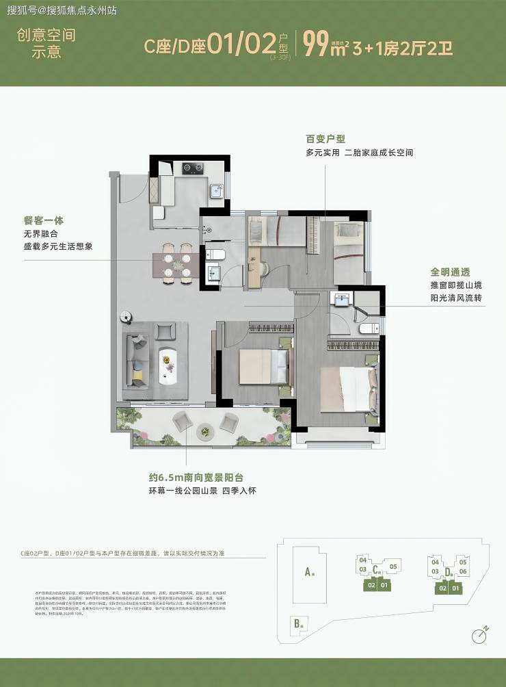 99㎡三 + 1 房两厅两卫(竖厅格局):客厅 3.8 米开间,连接 6.5 米长阳台,三开间朝南,主卧 14.12㎡(带独立卫浴)。次卧可改造为 “房中房”,满足二孩家庭或老人同住需求。得房率:约 80%,阳台赠送一半面积。