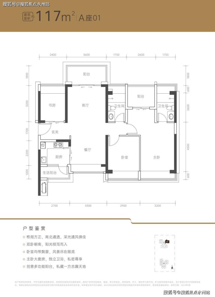 117㎡3+1房2厅2卫:竖厅南北通透格局,客厅3.6米开间,四开间朝南,4个卧室分别做到了3.2米/2.9米/2.6米/2.4米的宽度,阳台主朝正北向。户型亮点:南北通透,中心楼王公园景观,三开间朝南,端头位且独门独户,卧室均带飘窗。折后总价741-836万/套,单价6.44-7.15万/㎡。