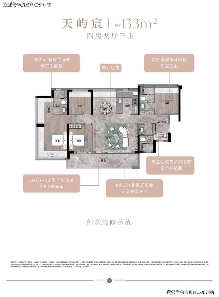133㎡的4房2厅3卫,竖厅南北通透格局:客厅5.4米开间,餐客厅分离设计,分别做到了主卧24.5㎡/次卧10.2㎡/次卧8.96㎡/次卧7.84㎡(实测面积),客厅连接次卧出12.3m²的观景大阳台,L型中式+岛台灵动式厨房,公卫三段式干湿分离,得房率约79.5%(不含赠送),套内面积105.78㎡,阳台主朝东南或西南向。