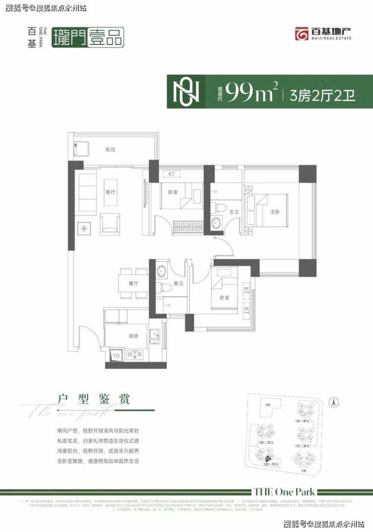99㎡的3房2厅2卫,设计的是经典竖厅格局,进门入户玄关,客厅3.9米开间,LDKB一体化设计,动静分区,四开间朝南,主卧三面飘窗,U型厨房,卫生间干湿分离,得房率:71.29%(不含赠送),东南朝向。