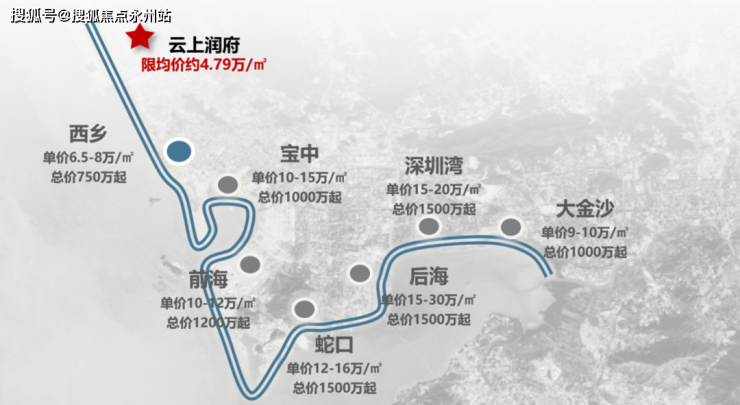 纵观深圳西部海岸线,西乡6-8万/㎡,宝中、前海10万+,蛇口、深圳湾这些纷纷迈入15万+,就连比较偏的沙井和塘尾都要5万+/㎡,福海的云上润府毛坯限价4.795万/㎡,还处于真正的洼地上,我愿称之为“11号线价格最卷项目”。