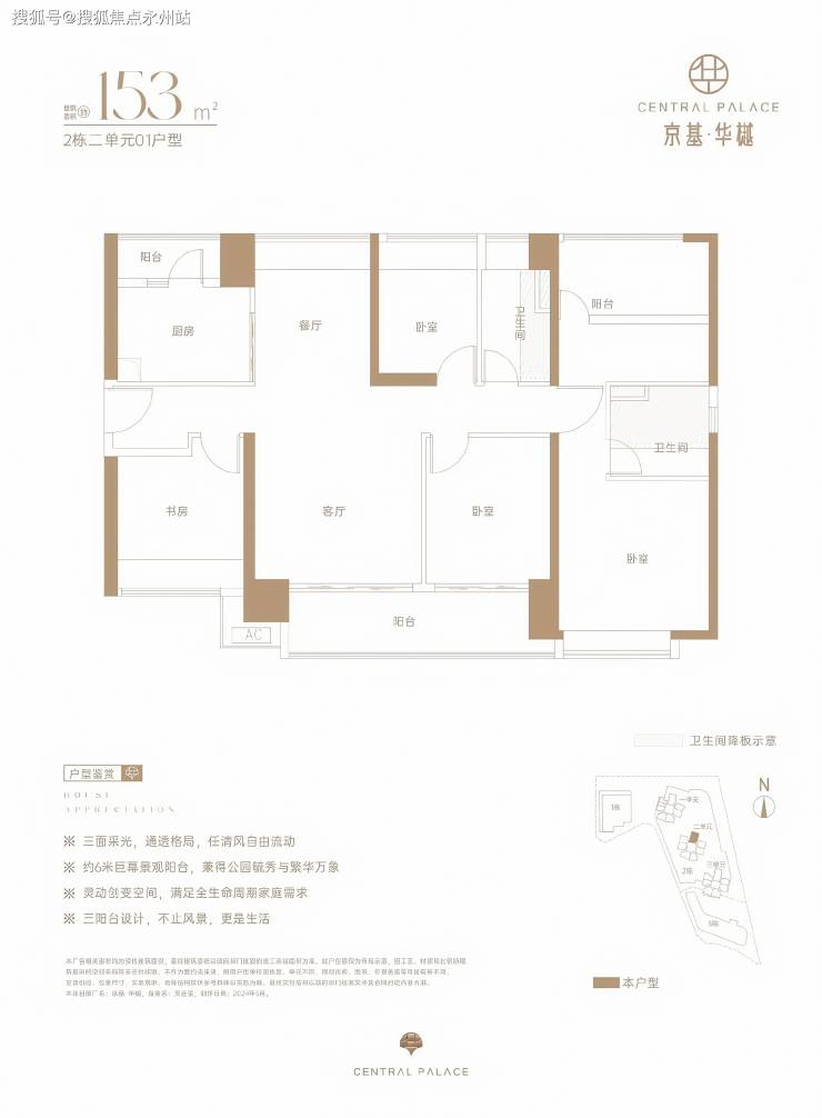 项目主推户型为95-153㎡的三至五房,另有222㎡稀缺大户型,涵盖刚需至高端改善需求。所有户型均采用LDKB一体化设计(客厅、餐厅、厨房、阳台连通),强调动静分区与空间利用率,得房率约73%(不含赠送面积),计入飘窗、阳台等赠送面积后可达85%。