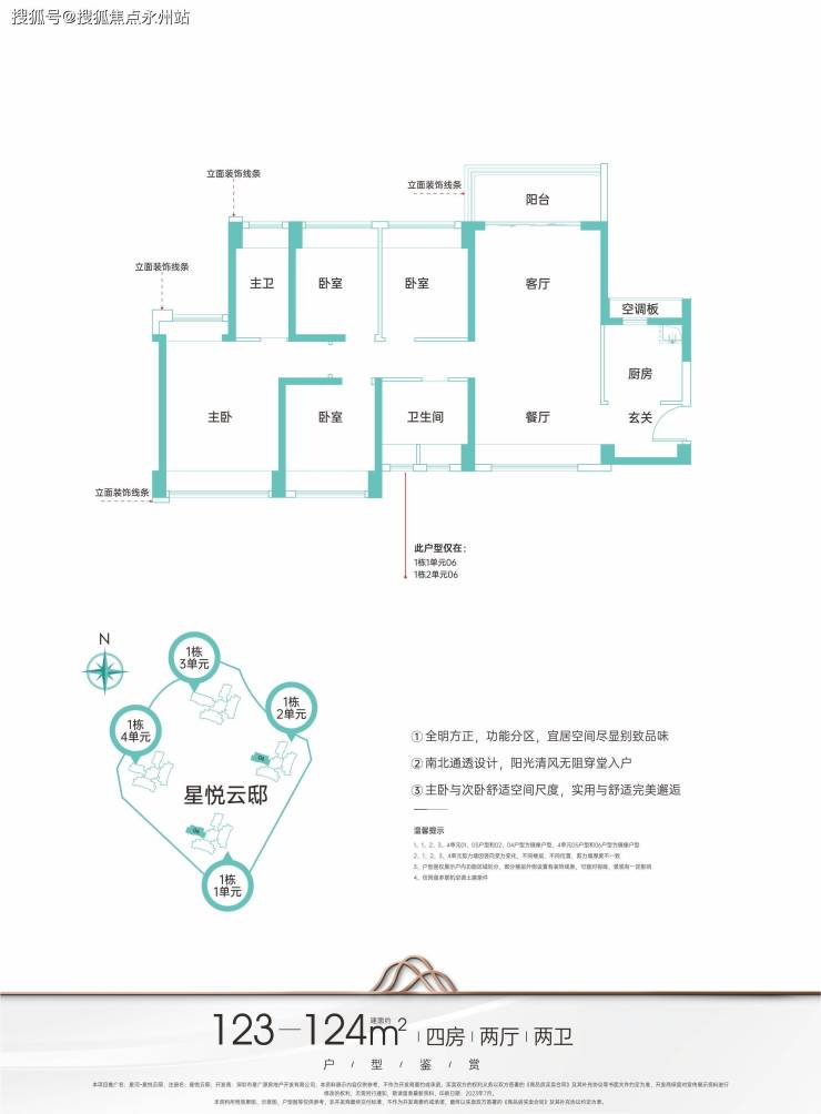 123-124㎡的4房2厅2卫:设计的竖厅南北通透格局,进门独立入户玄关,全屋飘窗设计,U型厨房,得房率:78.15%(不含赠送),阳台主朝东北向。