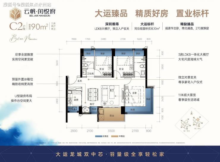 改善标杆:LDKB 一体化横厅开间达 6.9 米,客厅带 5.2 米跑道式阳台,全屋飘窗数量达 9 个(含厨房、卫生间),主卧套房含独立衣帽间及卫浴。
