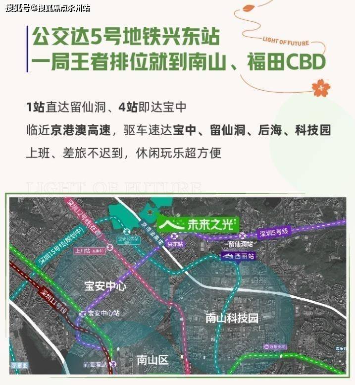 以项目为中心,2公里即可到达宝安中心,4公里到留仙洞、5公里到南山科技园,密布的轨交路网更是进一步将未来之光与各个核心点相连接。