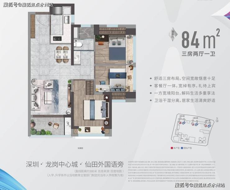 84㎡的3房2厅1卫:设计的是竖厅格局,客餐厅一体化,L型厨房,卫生间三段式分离,得房率:70.9%(不含赠送),阳台朝西南或东南向。