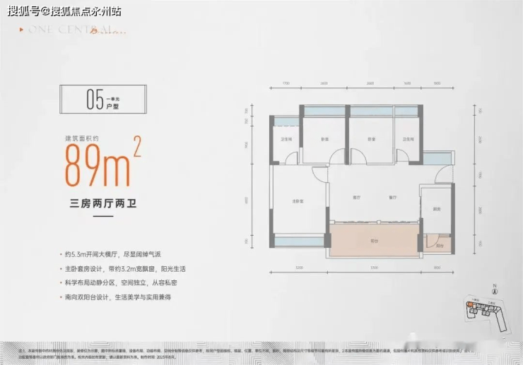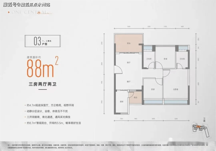 建面约88㎡3房2厅2卫:通透竖厅动静分区,LDK一体化布局,双阳台+4飘窗附加配置,区别于传统竖厅,它的入户门是中置的,动区部分通透对流,静区部分在特定条件下也可实现通透对流,市面上同建面能做到通透的竞品项目属实不多。