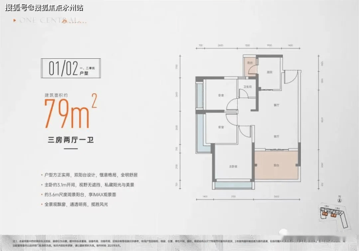 建面约79㎡ 3房2厅1卫:传统竖厅动静分区,LDK一体化布局,双阳台+3飘窗附加配置,比较经典,虽然整体会偏紧凑了些,但实用非常强,并且兼具低总价优势,3.6米的客厅开间尺度优于市面上大多数同建面户型。