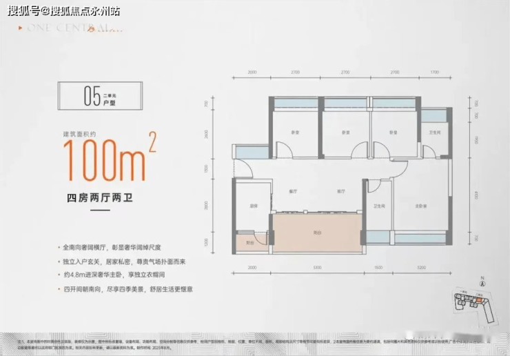 建面约100㎡ 4房2厅2卫:隐性过道横厅+5.1米宽景阳台,LDK一体化布局,宽景阳台+生活阳台+7飘窗的附加配置,结构与89㎡户型相似,除了动区部分小了0.82㎡外,其它功能间均有所放大,但差距微乎其微,主要还是多了一个卧室和公卫位置不一样的区别。