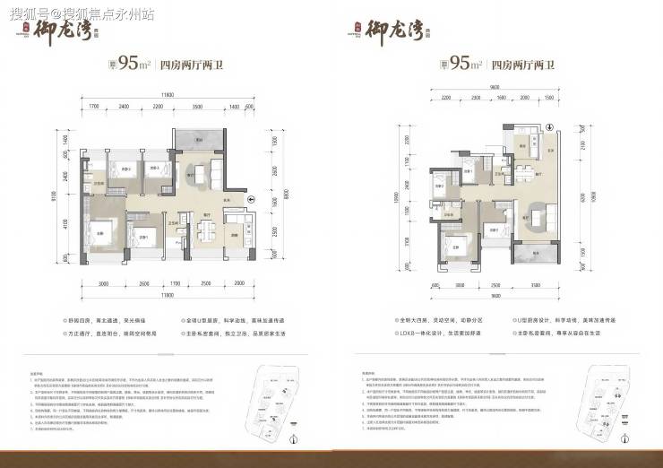 95㎡四房:南北通透格局,客厅开间3.5米,五开间朝南,主卧套房设计,得房率约79.25%(不含赠送)赠送后达88%-93%。