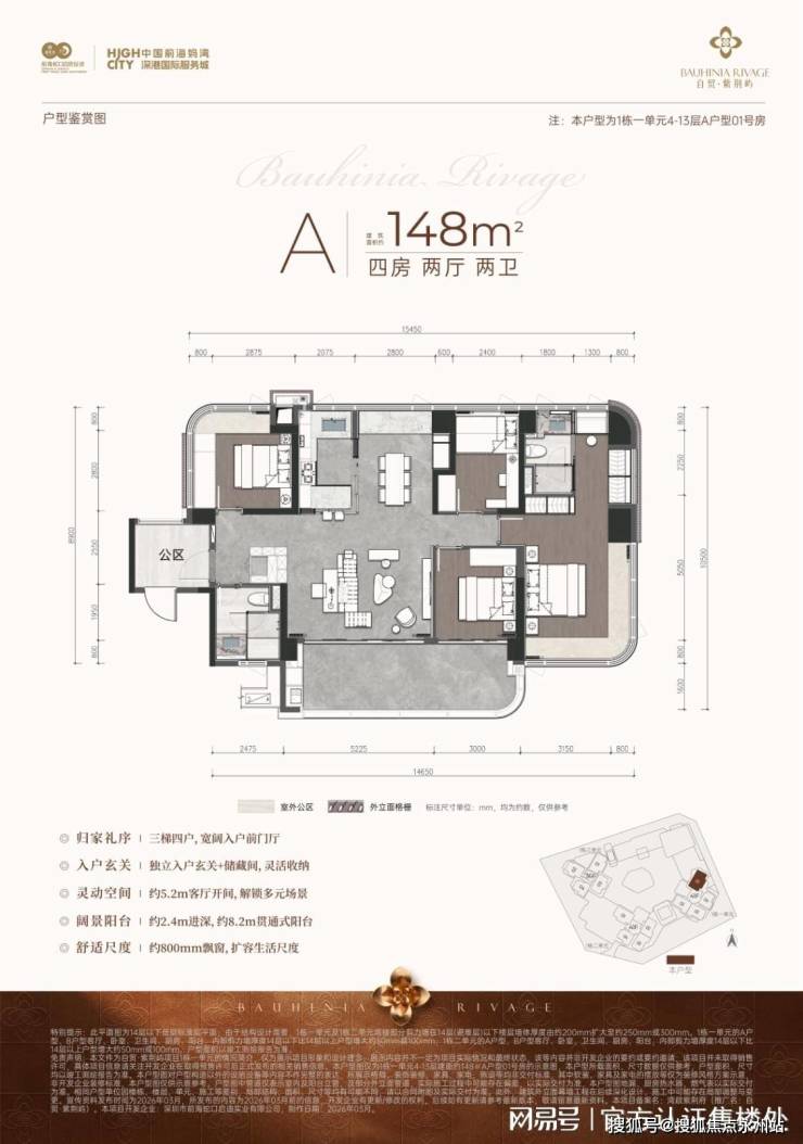A户型 (1栋一单元4-13层) 建筑148m²四房两厅两卫,设计亮点包括:三梯四户归家动线、独立入户玄关与储藏间、约5.2米客厅开间、约8.2米贯通式阳台(进深约2.4米)及约800毫米飘窗。