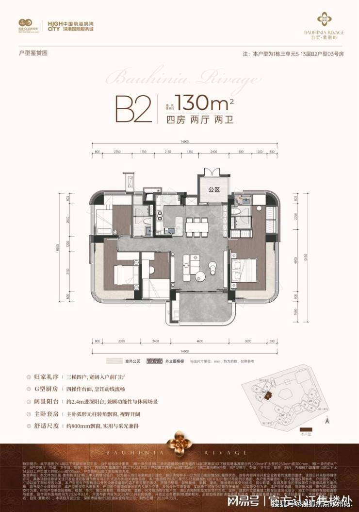 B2户型 (1栋三单元5-13层) 建筑130m²四房两厅两卫,设计亮点包括:三梯四户、G型厨房、约2.4米进深阳台、主卧套房带弧形无柱转角飘窗及约800毫米飘窗。