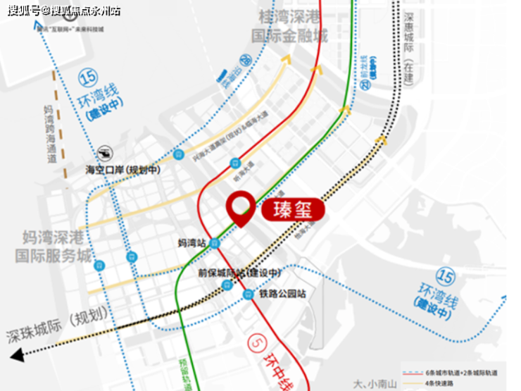 交通配套:瑧玺周边共规划6条地铁线、2条城际轨道、1条妈湾跨海隧道及1个海空口岸。