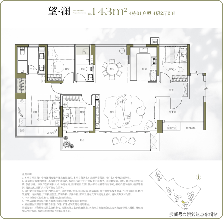 143㎡ 4房2厅2卫(奢阔改善型)楼王级户型,仅24套,稀缺性极强;超大横厅设计,搭配约8.9米南向山景阳台,视野无遮挡;270°主卧飘窗,采光与观景效果拉满;四分离卫浴,主卧套房+独立衣帽间,尊享高端居住体验,适配高端改善家庭。楼栋分布:仅分布于核心楼栋,数量稀缺