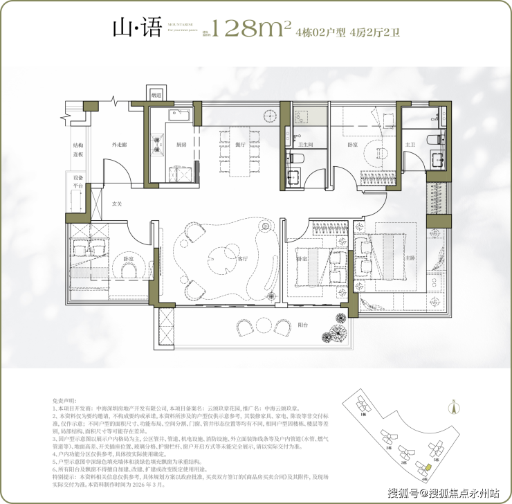 128㎡ 4房2厅2卫:横厅/竖厅双选,可根据家庭喜好选择;南北通透,通风效果佳;独立玄关设计,保护隐私;动静分区清晰,五开间朝南,客厅宽敞明亮,是项目爆款户型,适配中端改善家庭。楼栋分布:全楼栋覆盖,128㎡为横厅主力款
