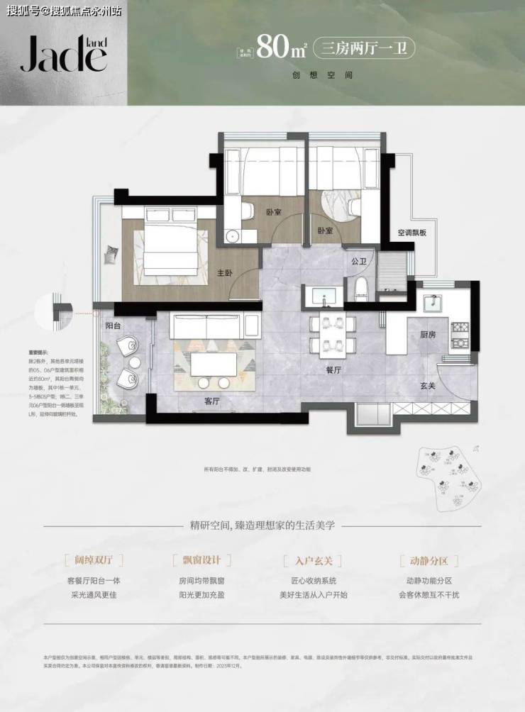 80㎡的3房2厅1卫,设计的是竖厅格局,S墙设计预留冰箱位,U型厨房,卫生间三段式分离设计。