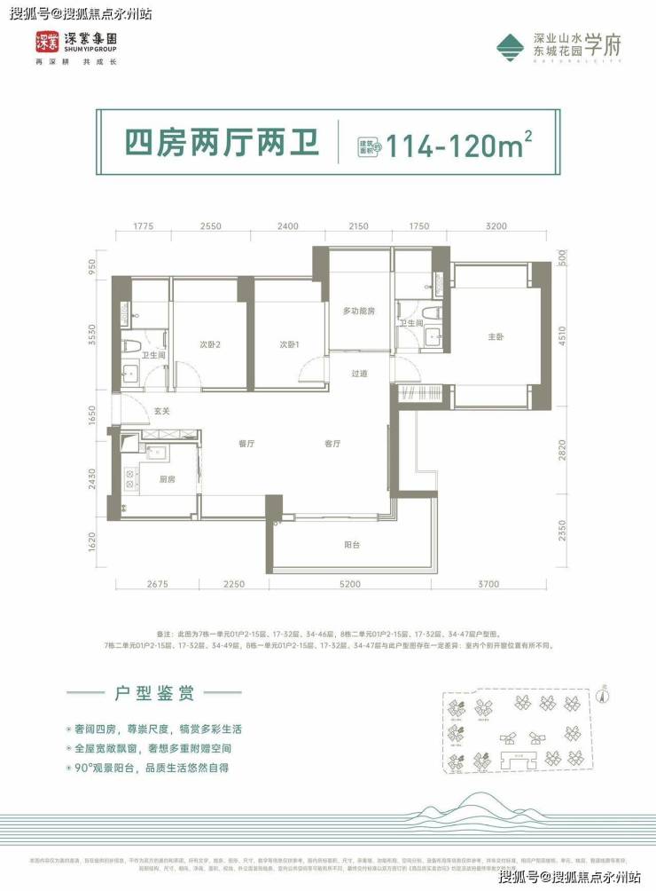 114-120㎡的4房2厅2卫,设计的是横厅南北通透格局,客餐厅一体化,4个卧室,主卧南北通透,5.2米长的L型大阳台,U型厨房,卫生间干湿分离,阳台主朝东南向。