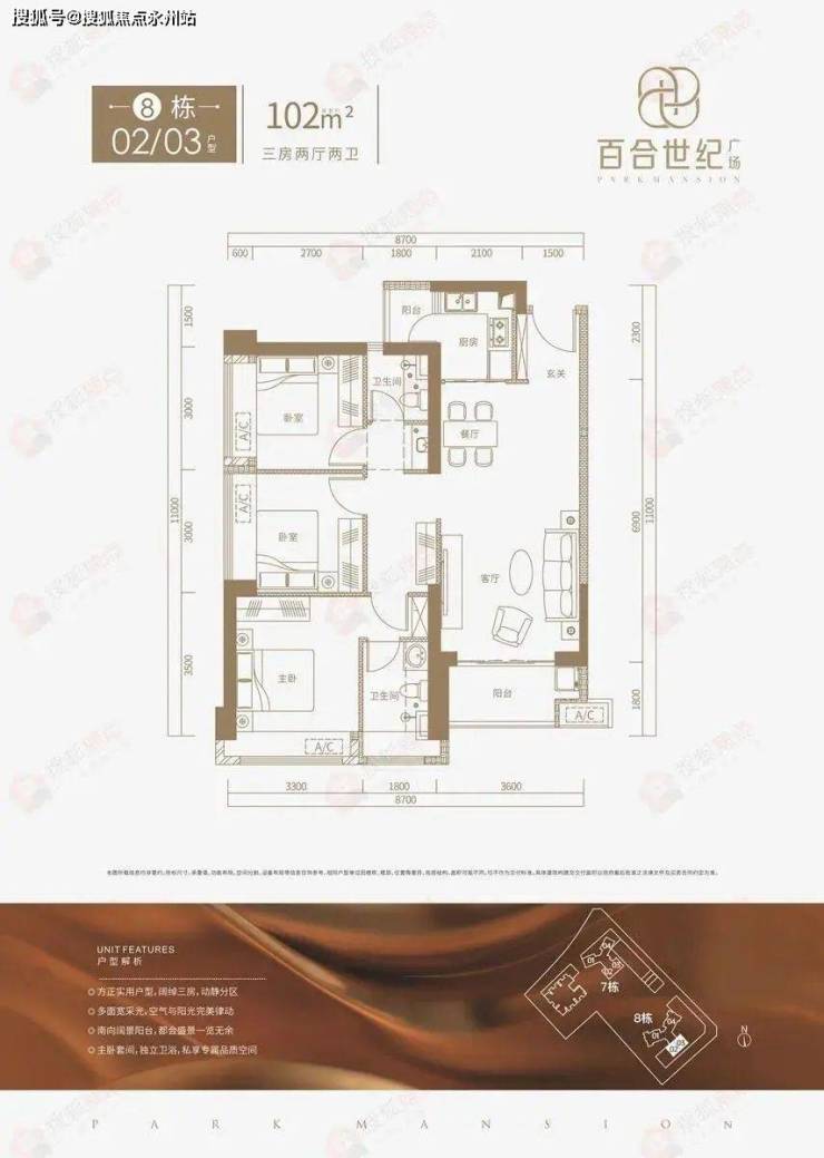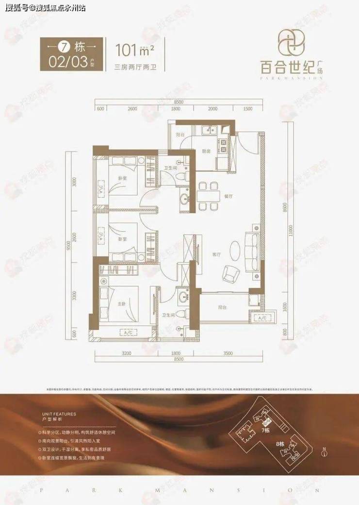 百合世纪广场主推101㎡(7栋)、102㎡(8栋)、121㎡(7栋)、174㎡(8栋)户型。其中101-102㎡户型为传统竖厅布局,东南朝向,121-174㎡户型为客餐厅独立布局,带双阳台,南北通透。