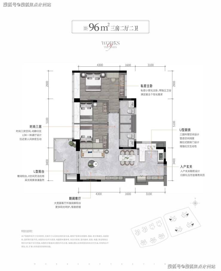 约96㎡三房两卫(3/4栋01户型)竖厅格局,餐客一体,客厅开间约3.4米,卫生间干湿分离设计,L型阳台,有东南、西南朝向。