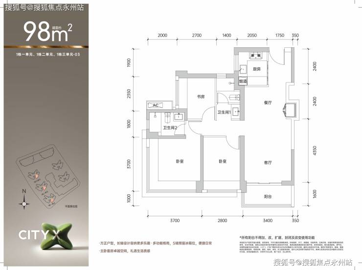 98㎡户型:分东北向(全明采光)和东南/西南向(三开间朝南),可根据需求选择。