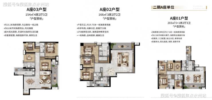 203㎡5+1房:总价1138万-1365万,单价约6.3万/㎡,270°转角飘窗,享一线海景。