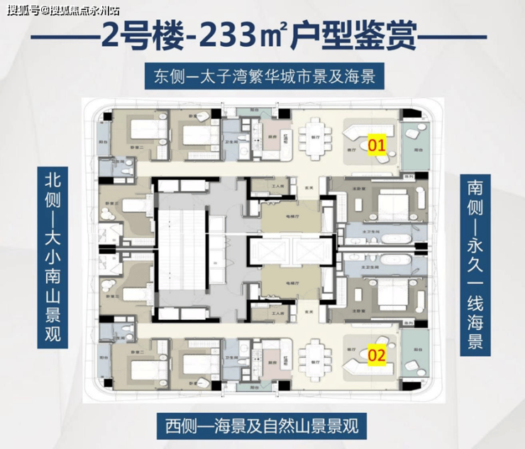 太子湾·鲸域,傲立湾海首排之巅,仅献尊贵70席,约233-307㎡的纯粹大户型海景公寓,尽揽南向一线海景的壮阔视野。其约3.6m的奢阔层高,打造无与伦比的居住空间;户户均配置三面景观阳台,将美景尽收眼底。此外,1:1.5的黄金车位比,确保每位业主的便捷出行;3梯2户的设计,更是让尊属体验更上一层楼,专梯入户,从容尽显。这样的稀缺顶阶豪宅配置,无疑是湾区塔尖人物生活尊崇格调的完美诠释。_营销中心_Vip Tel:400-992-0669 中介勿扰