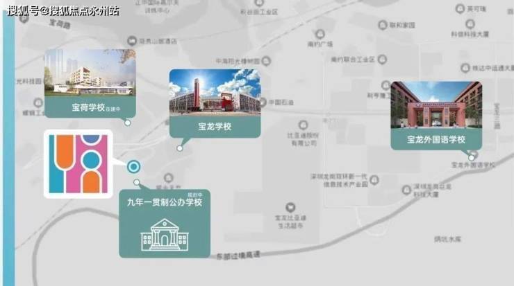 项目自带12班制幼儿园,与宝龙学校(小学46个班,初中12个班,共计58个班)仅一路之隔,步行距离约700米。周边还有宝龙外国语学校、宝荷学校(在建中)、九年一贯制公办学校(规划中)等教育资源。