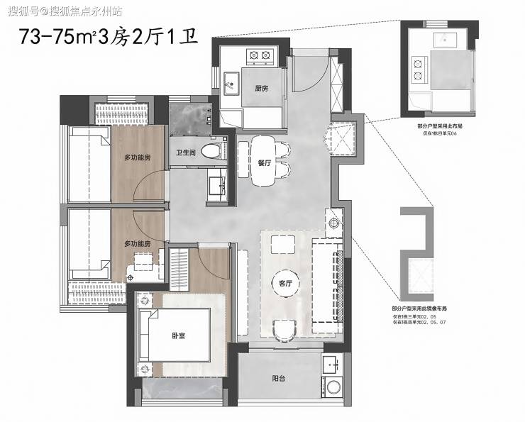 建面约73-75㎡3房2厅1卫,是项目很受欢迎的户型。这款户型最大的亮点就是做出了市面上85平三房的既视感,实用率高,实属难得。