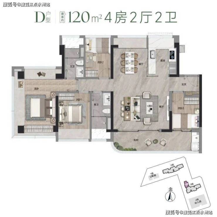 120㎡D户型只有一条腿,也是南北通透的设计。进门的第一个房有点小且不太好利用,做书房更为合适。客厅开间大,结合大阳台设计,整体也是三面采光。
