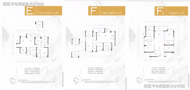 115-117㎡的4房2厅2卫(E3户型,仅3栋1/2单元有),设计的是横厅南北通透格局,客餐厅6.5米开间,LDKB一体化设计,动静分区,4个卧室分别做到了3.35米/3米/2.8米/2.65米的宽度,L型厨房,卫生间干湿分离,得房率:78.42%(不含赠送),阳台主朝西北向。
