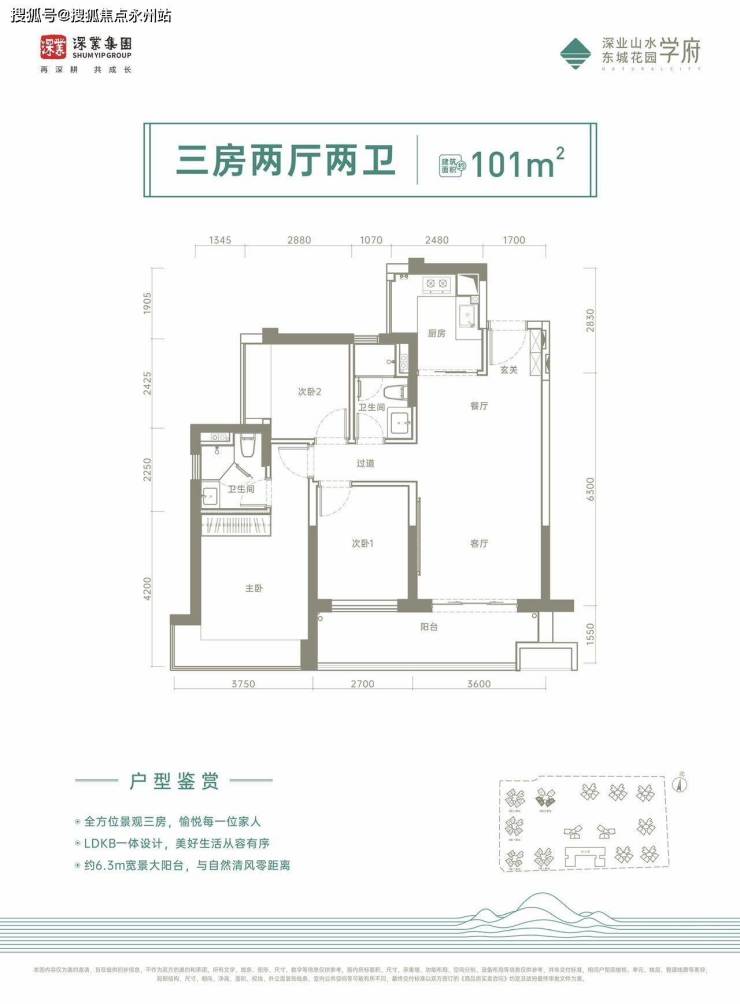 101㎡的3房2厅2卫,设计的是经典竖厅格局,进门入户玄关,客厅3.6米开间,LDKB一体化设计,三开间朝南,3个卧室分别做到了3.75米/2.7米/2.42米的宽度,客厅连接次卧出6.3米的大阳台,U型厨房,卫生间干湿分离,得房率:75%(不含赠送),西南或东南朝向。