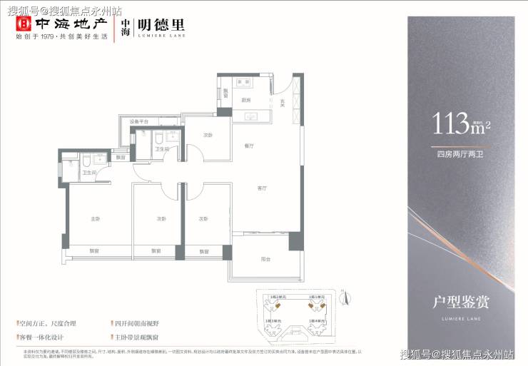 住宅房源建筑面积约为83-113㎡,提供3-4房的户型选择,均为精装交付。